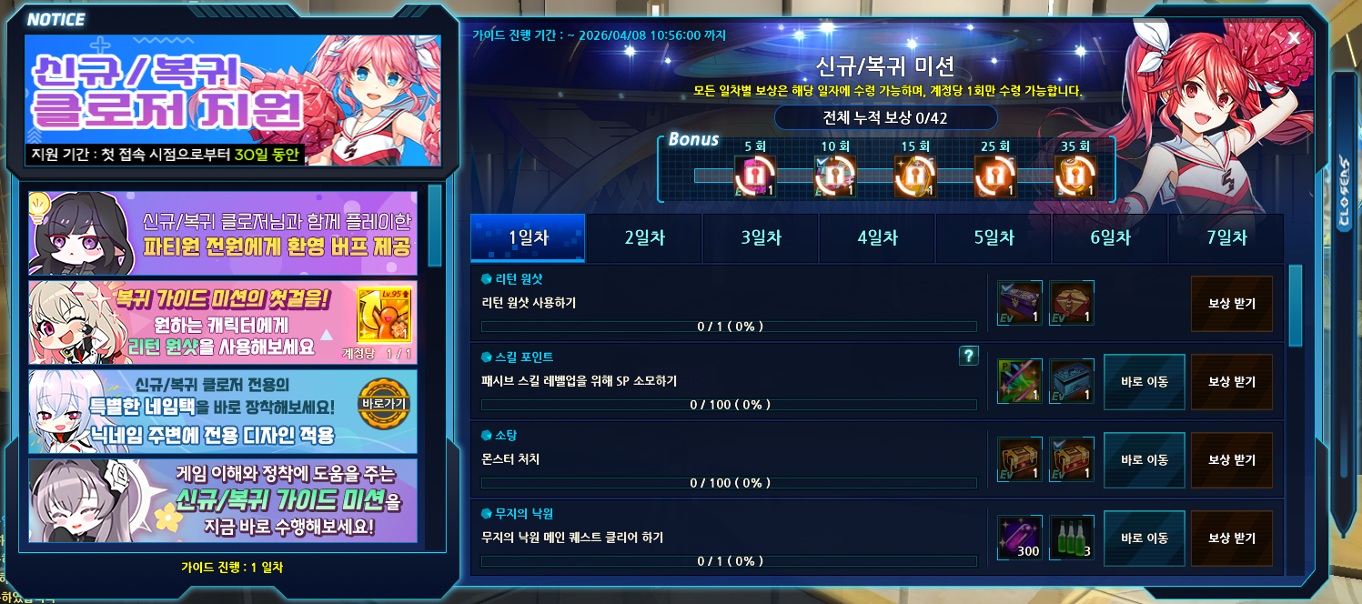 - 신규 복귀 가이드는 이전과 동일하게 신규/복귀 버프 잔여 기간이 남아있을 때 등장하며,