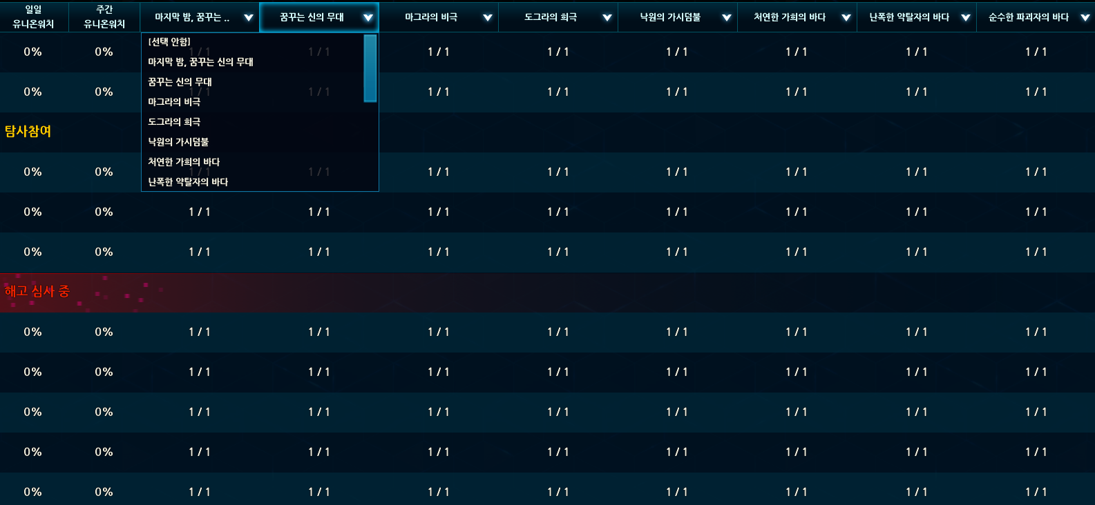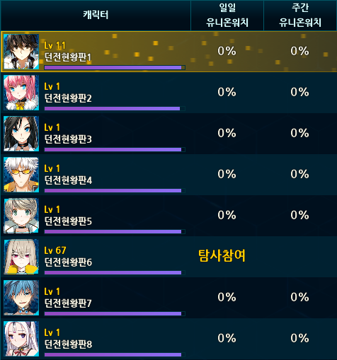 - 선택한 탭에 저장되어 있는 던전의 진행 상태가 캐릭터별로 노출된답니다!