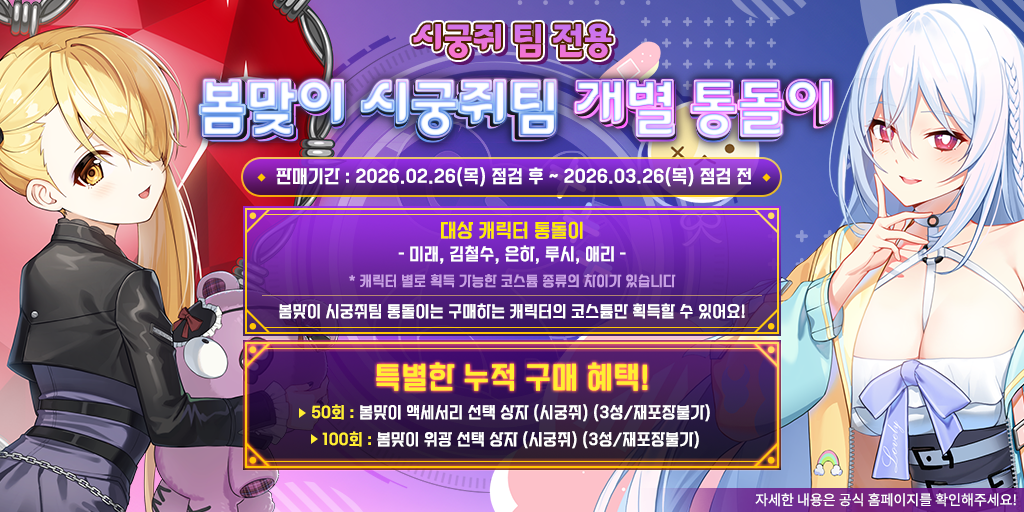 - 봄맞이 시궁쥐 통돌이는 시궁쥐 팀만 구매가 가능합니다. (김철수, 미래, 은하, 루시, 애리)