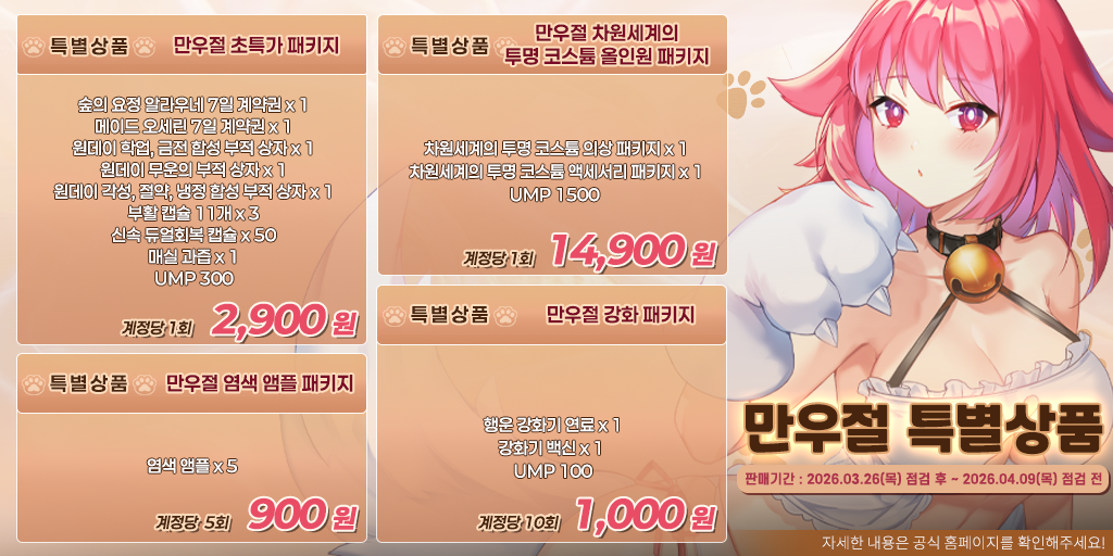 - [특별상품] 만우절 강화 패키지는 계정 당 10회만 구매 가능합니다.