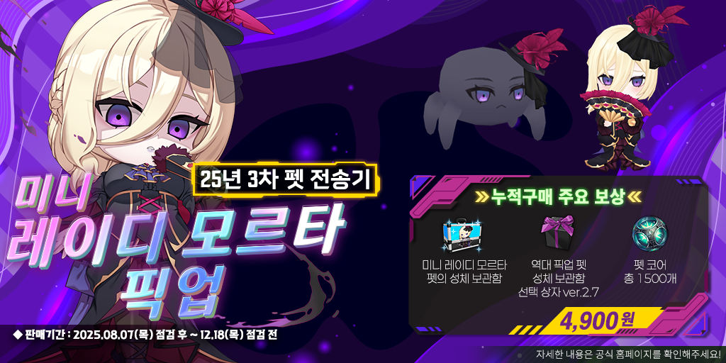 ※ ‘25년 3차 펫 전송기’에서는 픽업 펫으로 선정된 [미니 레이디 모르타 펫]을 다른 특급 펫들보다 높은 확률로 획득할 수 있습니다.