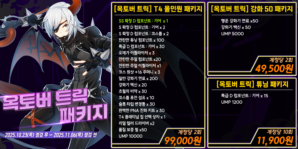 - [옥토버 트릭] 강화 50 패키지는 계정 당 2회만 구매 가능합니다.