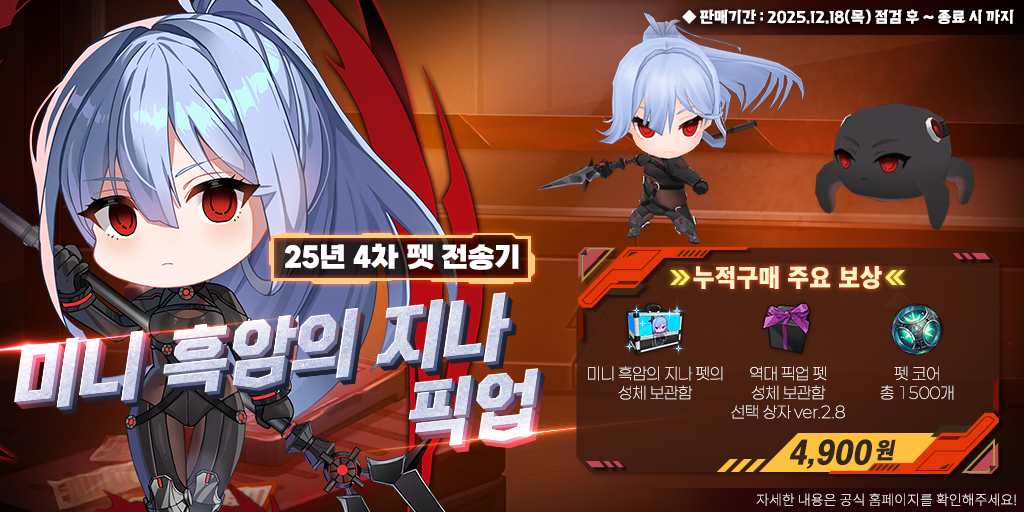 ※ ‘25년 4차 펫 전송기’에서는 픽업 펫으로 선정된 [미니 흑암의 지나 펫]을 다른 특급 펫들보다 높은 확률로 획득할 수 있습니다.