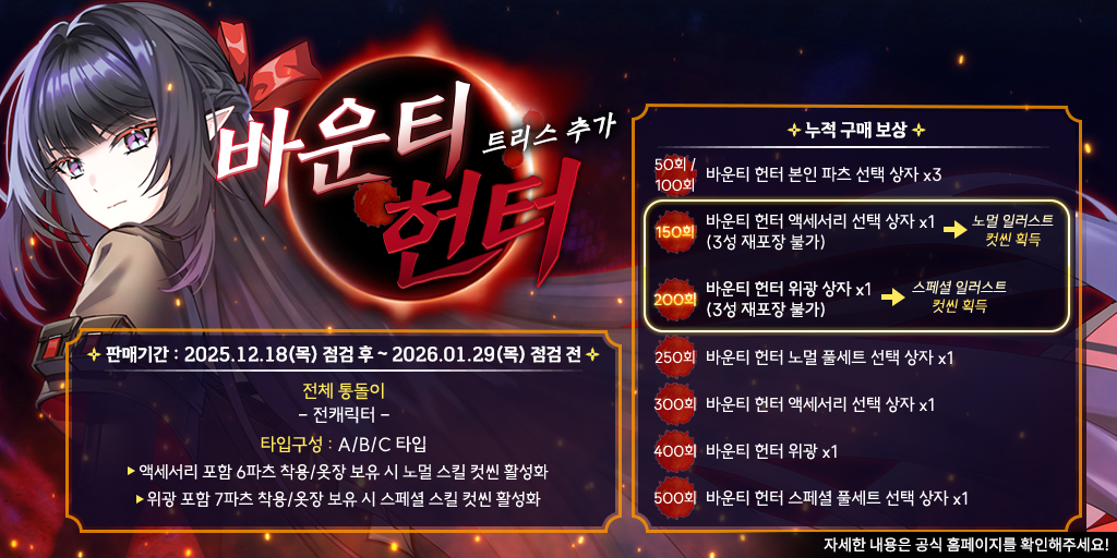 - 누적 구매 보상 중 150회, 200회에서 지급되는 ‘바운티 헌터 액세서리 선택 상자’와 ‘바운티 헌터 위광 상자’의 구성품인 ‘바운티 헌터 마스크’, ‘바운티 헌터 위광’ 아이템은